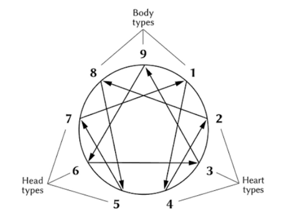 The Enneagram map is grouped into three buckets of three based on the idea that humans process information through three forms of intelligence or “centers of intelligence”: the head, the heart, and the body.
