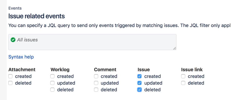 Jira is a webhook-only integration and requires a Jira administrator configure events to be sent to Range servers. We recommend sending all issue-related events, however, Jira can be configured using JQL to filter events, such that certain projects are excluded.